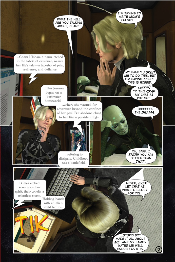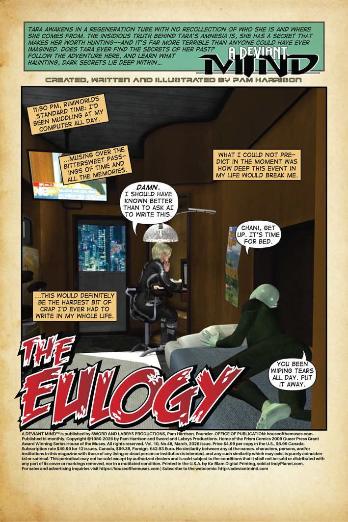 It’s also important that you’re including Transgender people in your series, Pam. Just another thing about it to be proud of. (A Deviant Mind) is ground-breaking in that respect. There are comics with third and non gender characters but none so popular and well executed that I know of. Thank you for contributing to our visibility.